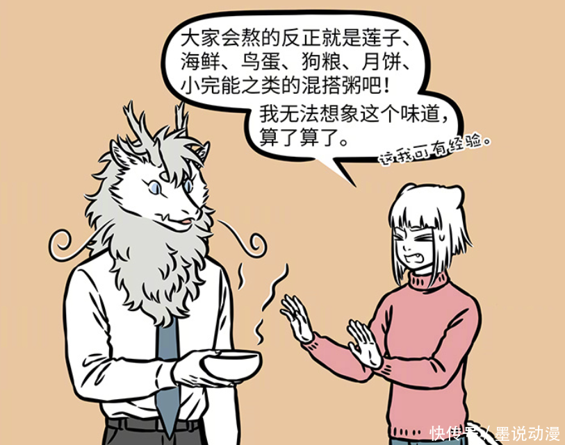 九月以为全球熬的腊八粥,内部有莲子、海鲜、鸟蛋、狗粮、月饼和干脆面。看来这腊八粥是由敖烈、精卫、哮天、小玉和白泽共同完成,对于九月来说,这便是混搭粥。若是从食材来看,这粥的滋味难以思象,是以九月平直闭幕敖烈,示意不思喝。
