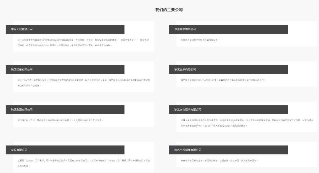 其中,映艺文娱有限公司是由刘德华创办的电影公司,主要业务为电影投资、制作及刊行方面,曾制作不少叫好叫座的经典电影,包括:《九一神鵰侠侣》《阿虎》《全职杀手》《爱君如梦》等。全国刊行方面,映艺文娱领有及代理接近四十部影片的刊行权,其中包括黄精甫的《江湖》、陈果的首两部在影展大放异彩的得奖作品《香港制造》及《旧年烟花绝顶多》等。