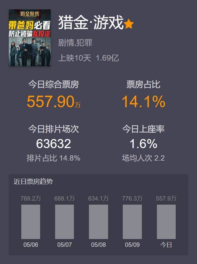 猫眼专科版数据夸耀,截止5月10日,五一档电影《猎金·游戏》票房已达到1.69亿元。
