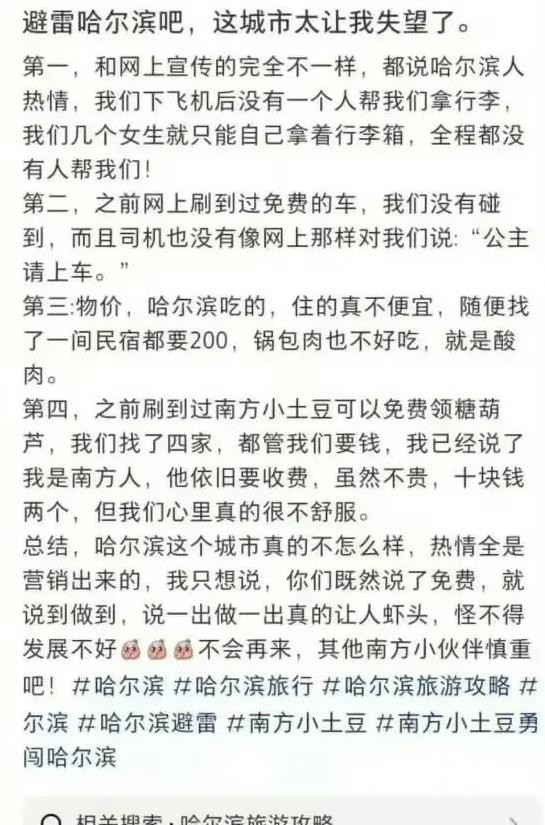 近两年,哈尔滨冬季旅游爆火,好多南边旅客为了体验不不异的过冬体验,纷繁北上,不夸张的说,统统这个词东北的旅游产业皆被周转了。1但也恰是前来游玩的“小土豆”越来越多,正所谓林子大了什么鸟皆有,一些教授不高的旅客,正在少量戳破碎东说念主们对“小土豆”们最运转的那份可儿的形象。