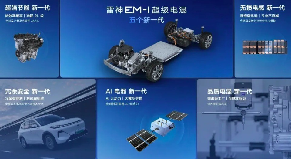 雷神超等电混专用发动机,其热驱散达到46.5%。在电驱方面,雷神EM-i超等电混摄取E-HDT 11合1混动电驱,系统更紧凑,电机驱散最高达到98.02%,电驱玄虚驱散高达92.5%,最高传动驱散高于98.8%。
