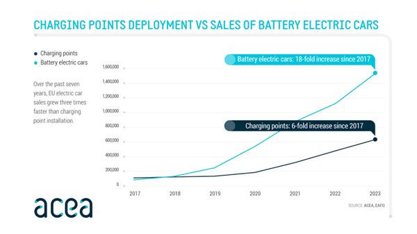 凭据欧洲汽车制造商协会( ACEA )的数据,在 2017-2023 年时期,欧盟电车销量的增长速率是充电桩安设速率的三倍。在 2023 年,悉数这个词欧盟安设了进步 15 万个全球充电桩,数目远远不够。