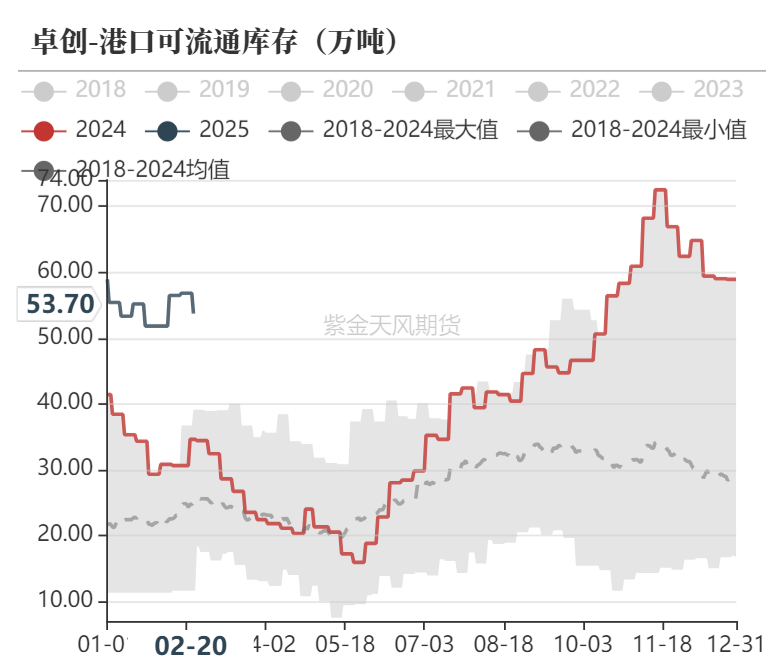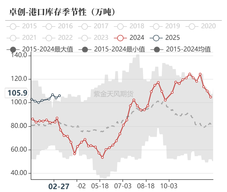 上周口岸库存105.9(+1.8)万吨,口岸可流畅库存53.7万吨,口岸去库仍未遣散,上周富德安设重启,入口减量肖似需求加多布景下,展望口岸库存拐点将至。