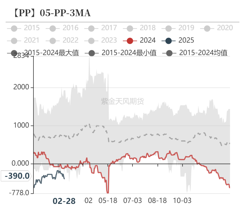 PP/L-3MA价差上周走弱,主要由于甲醇价钱反弹,近期烯烃重启肖似内地情谊较好支捏价钱,后期来看入口减量连接遣散,且MTO需求仍有增量预期,甲醇连接存眷多配,短期展望价差走缩。