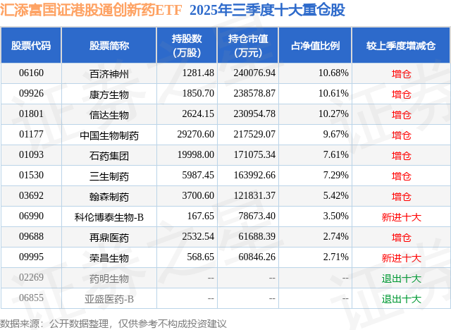 从基金限度来看,汇添富国证港股通更始药ETF基金2025年三季度公布的基金限度为224.87亿元,较上一期限度78.02亿元变化了146.85亿元,环比变化了188.22%。该基金最新一期钞票确立为:股票占净值比98.04%,无债券类钞票,现款占净值比3.42%。从基金持仓来看,该基金当季前十大股票仓位达70.5%,第一大重仓股为百济神州(06160),持仓占比为10.68%。