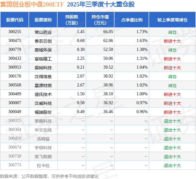 从基金畛域来看,富国创业板中盘200ETF基金2025年三季度公布的基金畛域为0.38亿元,较上一期畛域5606.33万元变化了-1789.58万元,环比变化了-31.92%。该基金最新一期钞票成就为:股票占净值比99.47%,无债券类钞票,现款占净值比0.76%。从基金握仓来看,该基金当季前十大股票仓位达12.06%,第一大重仓股为常山药业(300255),握仓占比为1.73%。