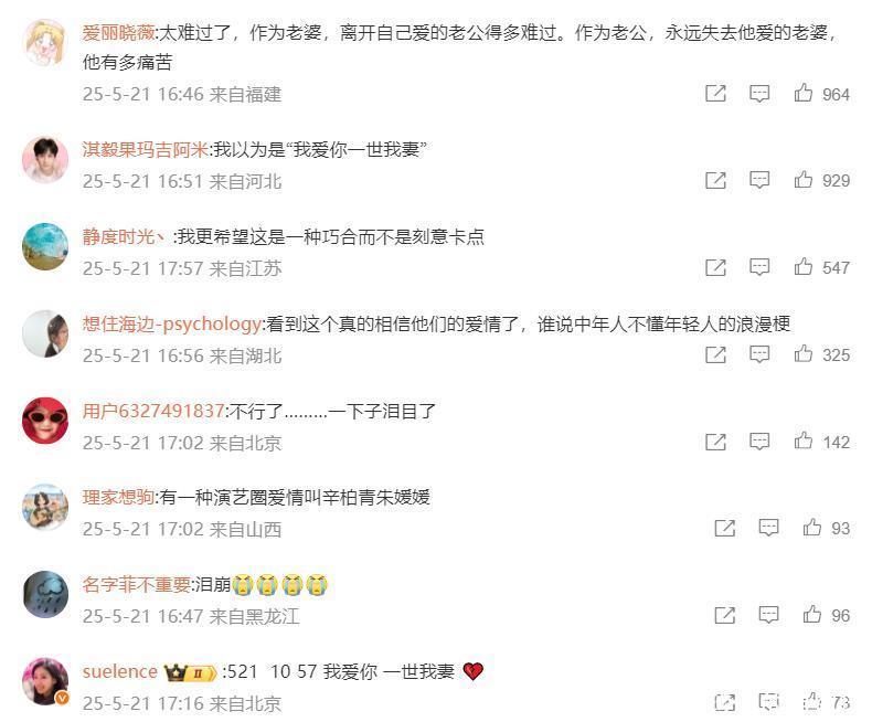 辛柏青发布讣告的时分是5月21日10点57分,网友以为这是“我爱你你是我妻”的谐音。