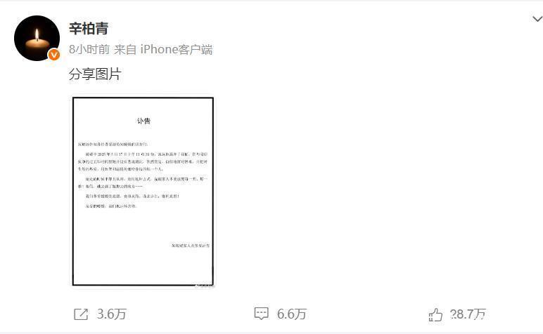 当今,辛柏青一经将酬酢账号头像换成了白色烛炬,诋毁着一火妻。