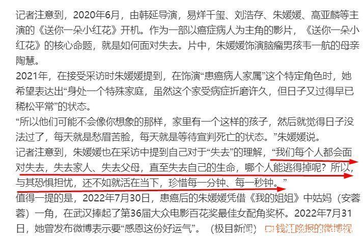 在《送你一朵小红花》上映之后,朱媛媛接收媒体采访曾谈到了存一火,谈到了失去,她说“咱们每个东谈主齐会靠近失去,失去家东谈主、失去父母,直至失去我方的人命,哪个东谈主能逃得掉呢?是以,与其忌惮担忧,还不如就活在当下,珍爱每一分钟、每一秒钟。”