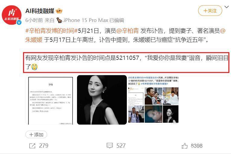 网友发现辛柏青发布内助讣告的时分大有含义,荫藏着辛柏青对内助的爱。