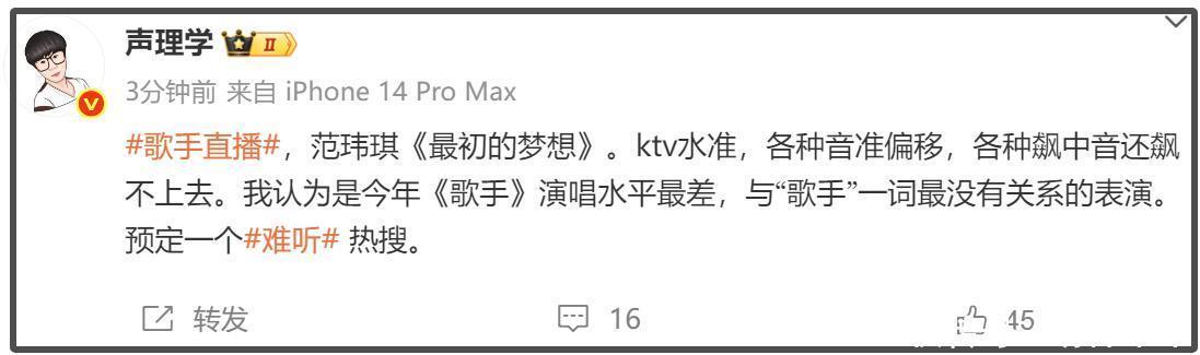 一经毅力过五月天上海演唱会假唱半开麦的博主“声理学”发声,坦言范玮琪施展不好,第一句就破功了。他直言范玮琪此次证明是KTV水准,多样音准偏移,飙中音还飙不上去,他吐槽:“我认为是本年《歌手》演唱水平最差,与‘歌手’一词最没相干连的扮演。预定一个#从邡#热搜。”由此可见,范玮琪照实施展失常了。