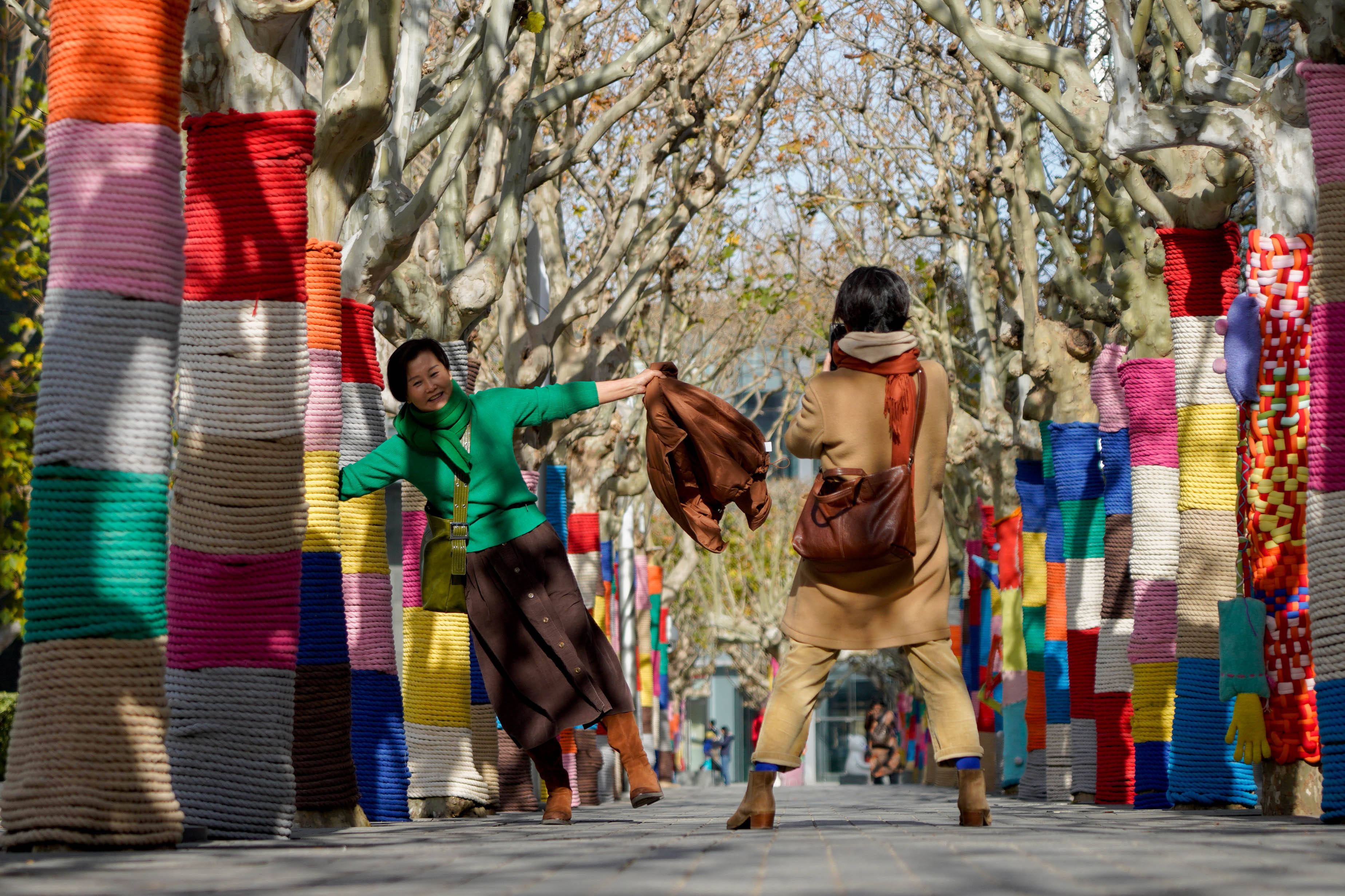 市民在披着彩色“古道外套”的行说念树间拍照。新华社记者 谢晗 摄
